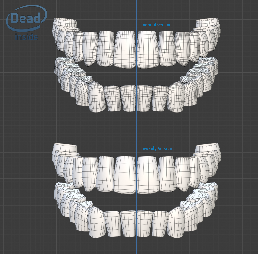 2 type of tooths (low-poly 8500 triangles, hi-poly 36000 triangles)